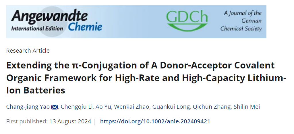 近日,BETWAY必威必威西汉姆联姚长江团队在国际顶级期刊《德国应用化学》(Angewandte Chemie International Edition)发表题为”Extending the π-Conjugation of A Donor-Acceptor Covalent Organic Framework for High-Rate and High-Capacity Lithium-Ion Batteries”的研究论文(DOI: 10.1002/anie.202409421),文章设计一种π-共轭扩展供体-受体有机框架材料用于高倍率和高容量锂离子电池。