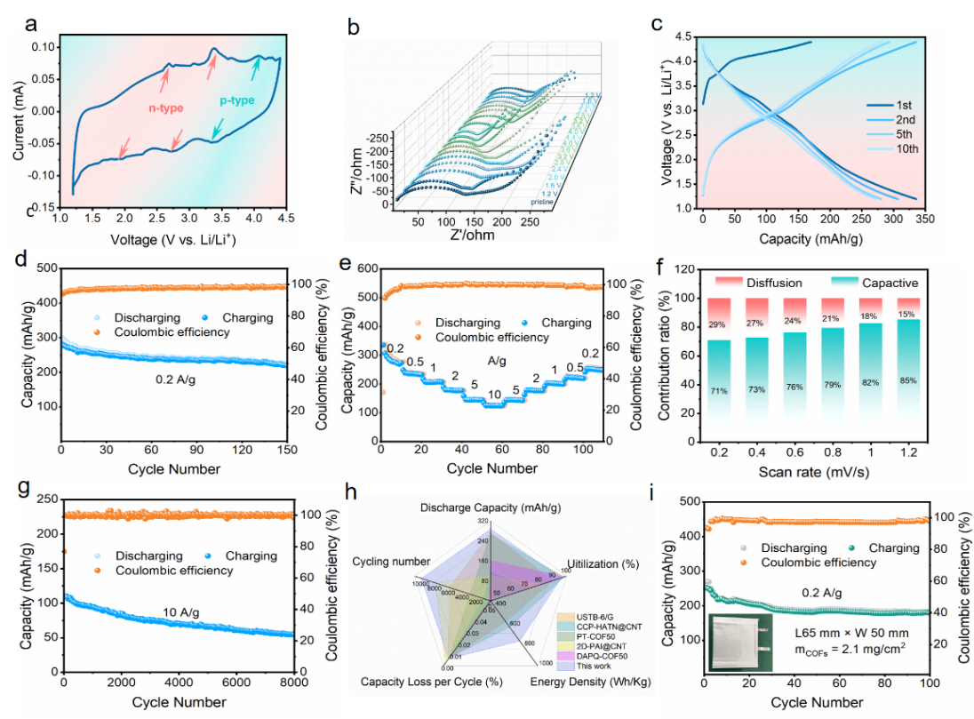 图3. BTT-PTO-COF 在碳酸酯电解液中的电化学性能及动力学分析 (a) 扫速率为0.2 mV s-1时的CV曲线;(b) 不同电压状态下阻抗图谱;(c-d) 0.2 A g-1电流密度下放电/充电曲线和200圈循环图;(e) 在电流密度下的倍率性能;(f) 在0.2-1.2 mV S-1范围内不同扫速下赝电容控制占比;(g) 在10 A g-1下8000次长循环图谱;(h) BTT-PTO-COF材料与文献中具有代表性的COFs正极材料的电池性能比较;(i) 软包电池在0.2 A g-1下循环100次的性能。