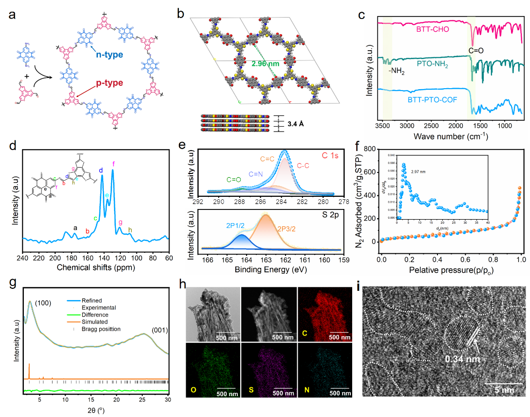 图1 (a) 合成路线;(b)模拟图;(c) BTT-PTO-COF 红外光谱图;(d)13C固体核磁共振(NMR)谱图; (e) XPS图谱;(f)氮气吸附等温线; (g) 粉末衍射图;(h)扫描电镜图;(i)高分辨透射图。
