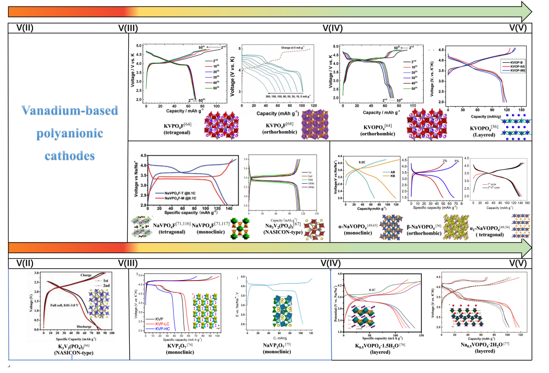 聚阴离子化合物是由MOx(M为过渡金属)和 (XO4)n−(X=P,S,as,Si,Mo或W)多面体组成的三维开放框架结构。其独特的结构具有许多的优势,如:良好的离子扩散动力学、由聚阴离子基团的诱导效应实现的高工作电压、快速的钠、钾离子扩散实现的高能量密度以及聚阴离子框架提供的热稳定性、安全性,使其在锂、钠、钾离子电池领域中作为正极材料具有非常普遍的应用。研究中对比了相似的聚阴离子正极材料在钠、钾离子电池中的不同结构、性能表现上的差异,对于发展高性能聚阴离子正极电池,拓宽和深化其应用领域具有指导意义。基于近年来的诸多研究进展,本综述围绕钒基、铁基、钛基三种类型的聚阴离子正极材料,较为系统地分析比较了它们在钠钾电池中离子嵌入/脱嵌机理、比容量、循环性能、倍率性能等方面的差异,总结和评述了不同材料在钠/钾离子电池中的优势,并对相关挑战和未来发展趋势进行了一系列地讨论。