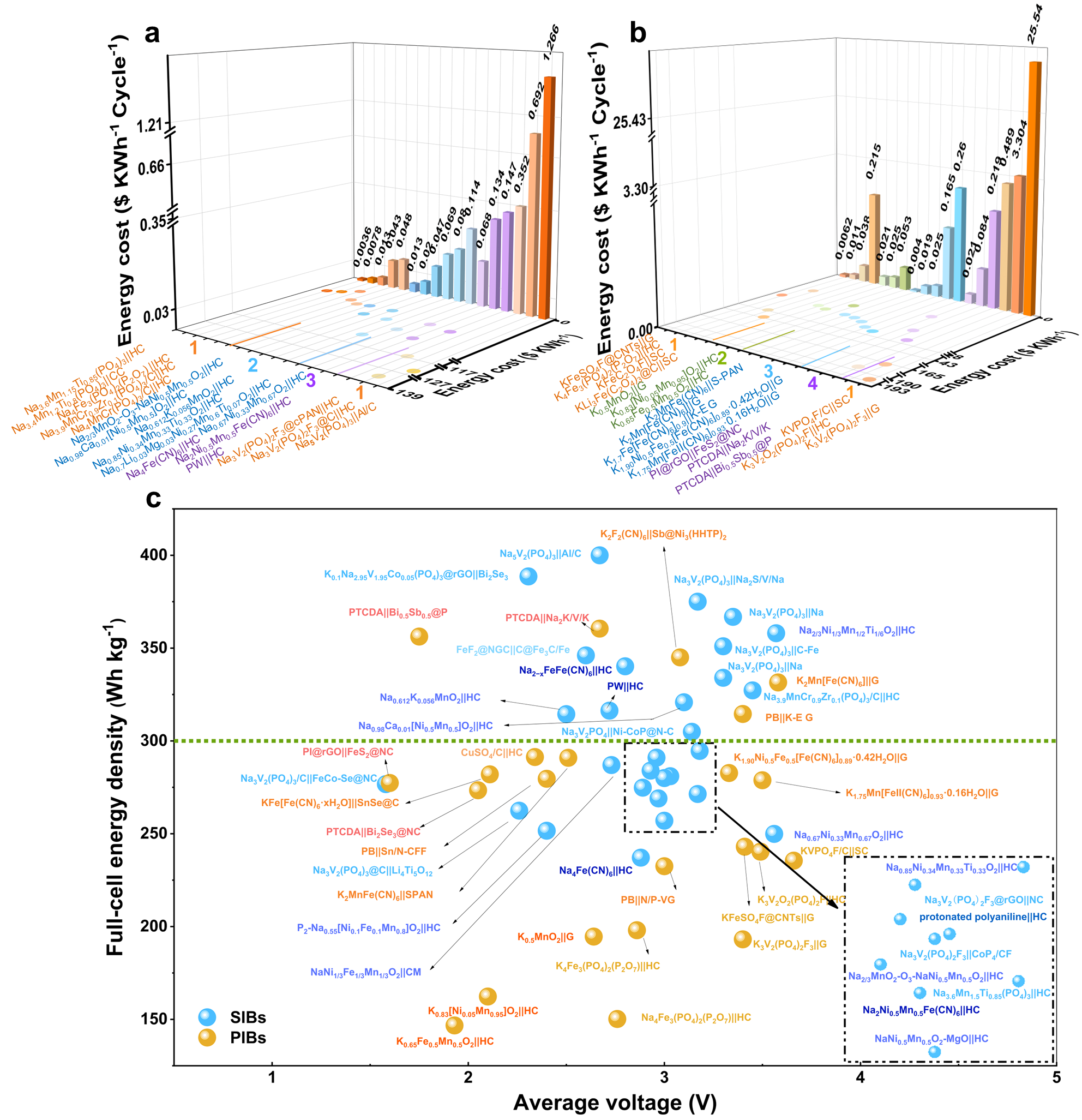 对各种电池体系的成本分析有助于确定其在大规模固定式储能应用中的实用价值。本综述给出了在不同电极价格等级和电池寿命水平下对SIBs/PIBs能量密度的具体要求,用于替代LIBs在大规模储能领域中应用,其中价格等级是基于近几年的研究现状,计算和总结不同全电池的投入成本后确定的。在电化学性能与成本($ kWh-1 cycle-1)相关联的曲线图中,根据SIBs/PIBs的实际成本,在给定的LIB标准下,确定了需要满足的能量密度,确保SIBs/PIBs体系在大规模储能应用中的经济优势。