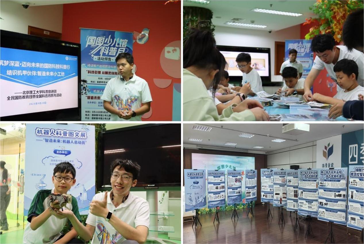2025年9月20日上午,科普宣讲团结合九三阅兵出现的智能无人系统装备,在国家图书馆面向青少年们开展“结识机甲伙伴:智造未来小工坊”机器人专题科普讲述,并指导参加的中小学生动手体验机器人设计制作,提升青少年们科学素养。此前,由必威西汉姆联兵器智能系教师代表提供的“制造未来:机器人总动员”图文展正在国家图书馆展出。