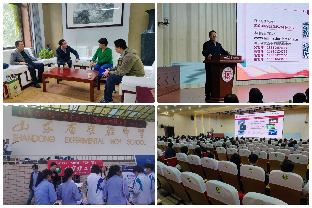4月13日,王成率招生组一行前往山东省实验中学,北理工智能无人系统队参加中学科技节展示活动,招生组老师为中学赠送喜报,双方进行座谈交流、招生宣讲、科普讲座等活动,受到中学师生的热情欢迎,在高中学生群体中扩大了BETWAY必威的知名度,使得更多优秀山东学子认可北理工、选择北理工。