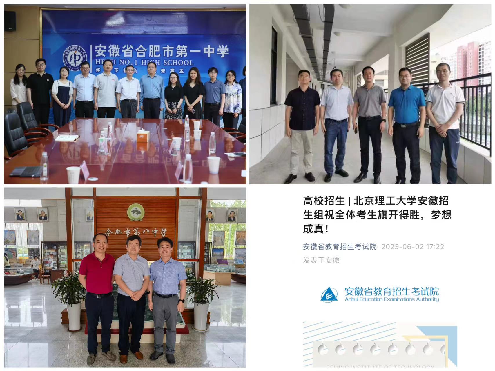 期间,学院领导班子积极与安徽省教育考试院对接,并兵分多路前往合肥一中、合肥八中、合肥168中学等重点高中进行招生宣传,均受到各高中的热情接待,并就高招季的宣传策略和工作方式达成了较好的意向,为6月份高招季考生报考我校奠定重要基础。