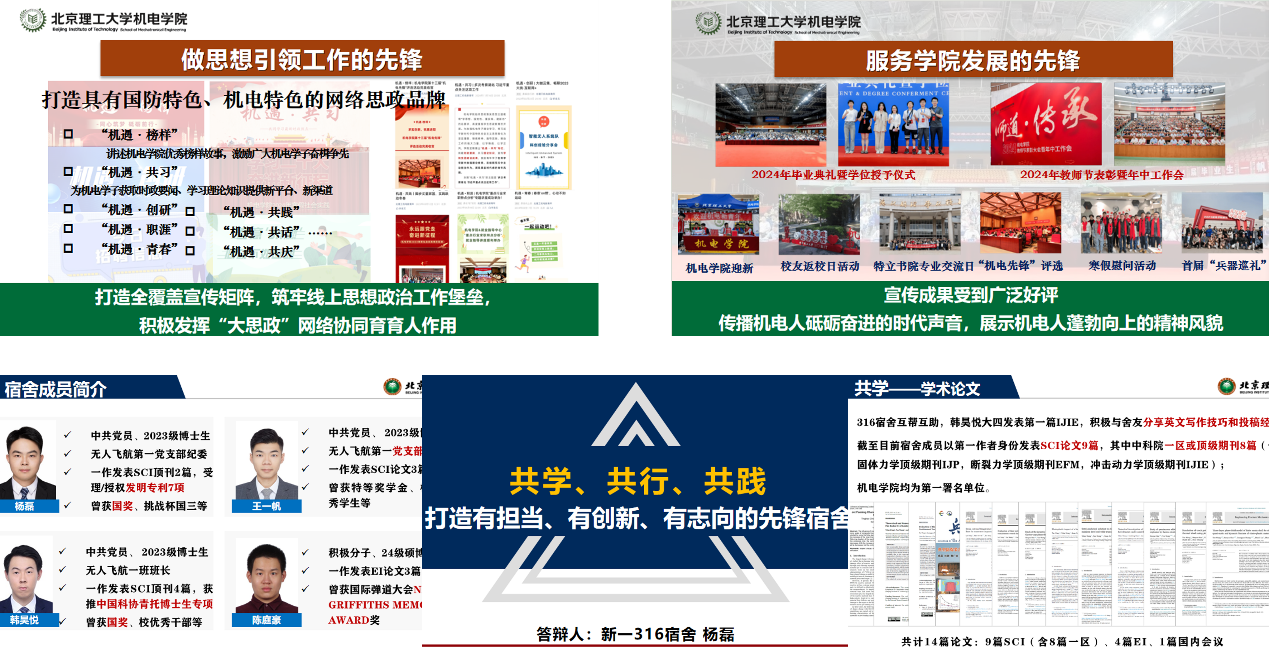先锋集体各展所长,从社团、班级课题组到宿舍,他们凝聚了青年骨干力量先锋、发挥了桥梁纽带作用,不仅筑牢线上思想政治工作堡垒,积极发扬“兵器精神”和“大思政”网络协同育育人作用,还通过“共学”、“共行”和“共践”全方位展示机电砥砺奋进、蓬勃向上的精神面貌。