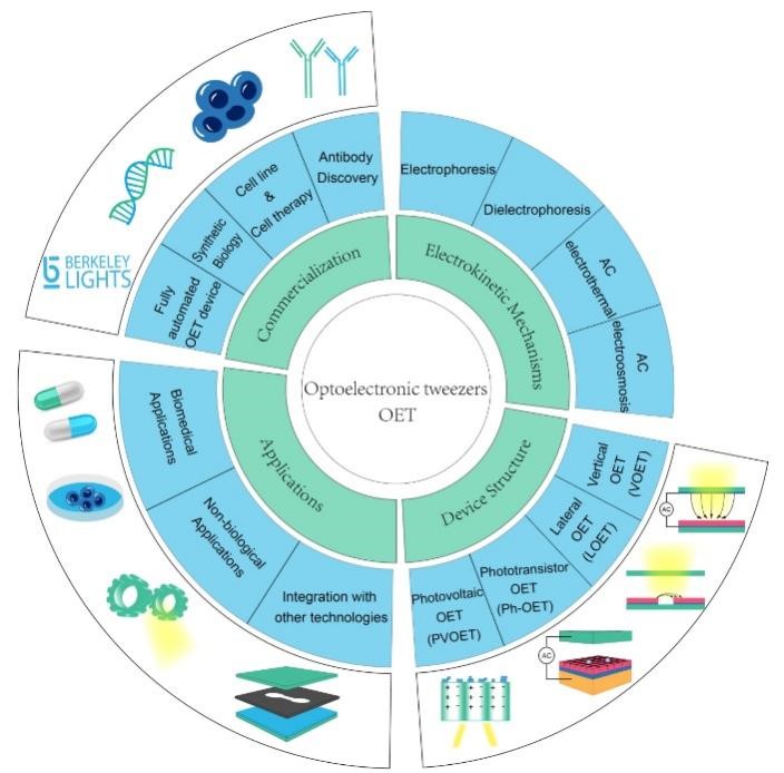 近日,BETWAY必威张帅龙教授在国际生物化学类顶级期刊《Chemical Society Reviews》(IF=60.615)上发表综述文章“Optoelectronic tweezers: a versatile toolbox fornano-/micro-manipulation”。该论文入选杂志主封面。该文章系统地介绍了光电镊技术的原理、芯片结构和系统构建,展示了该技术在细胞操作、微纳米材装配、医学检测以及微纳机器人等领域的应用,回顾了该技术的产业化进展(如图1所示)。最后论文总结了该技术的应用前景、局限性及未来的发展趋势。该论文第一作者与通讯作者为必威西汉姆联张帅龙教授,第二作者为必威西汉姆联2022级博士生徐冰睿,第一单位为BETWAY必威。该论文也得到了中科院沈阳自动化研究所刘连庆教授、北理工黄强教授、美国加州伯克利大学Ming Wu教授(光电镊发明者)、多伦多大学Aaron Wheeler教授的指导。